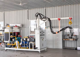 蓬莱强兴聚氨酯设备有限公司介绍: 发泡原理:不同组份原液,经精确配比和高速搅拌,由高精度计量泵,把各组分料液各自输送到搅拌头。经过高速强烈搅拌,使之料液均匀而喷出,形成所需产品。中吉生产的聚氨酯高压发泡设备根据用户需要可以精心设计不同系列的机型,具有较好的实用性和经济性,为用户生产不同产品、合理地选择机型提供了方便。设备主要由以下几个系统组成:料流系统、计量系统、...